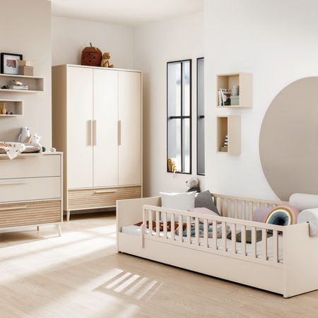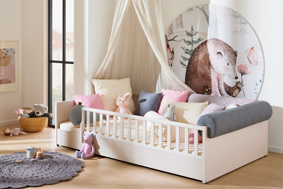 Das bodennahe Bett mit Erhöhungen an allen vier Seiten schafft deinem Kind ein gemütliches Nest für geborgenen Schlaf. Und wenn es ausgeschlafen hat, kann es durch den kleinen Einstieg selbständig aufstehen, spielen oder nochmal nach nebenan zu Mama und Papa zum Kuscheln ins Bett schlüpfen.