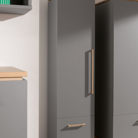 Sten setzt auf Kontraste: kühles Schiefergrau kombiniert mit warmen Holzakzenten im neu interpretierten Nordic-Design. Mit diesem Mix schaffst du eine gemütliche Atmosphäre im Kinderzimmer. Raffinierte Details wie schräge Standfüße und elegante Griffe verleihen dabei einzigartigen Charme.