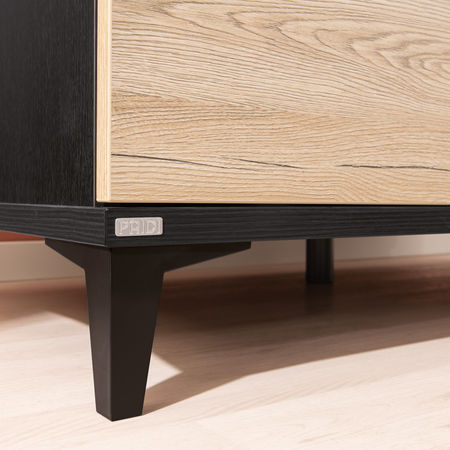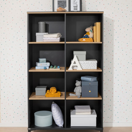 Tomke zeichnet sich durch das Zusammenspiel zweier Farbtöne aus : Schwarze Korpusse rahmen die Fronten aus warmen Holzdekor ein und verleihen den Möbeln einen urbanen Look . Die holzfarbenen Einlegeböden scheinen in schwarzen Regalen zu schweben und setzen Schönes sowie Nützliches in Szene. So gestaltest du ein zeitloses Babyzimmer, das später auch als Grundlage für ein Kinder- oder Jugendzimmer funktioniert.